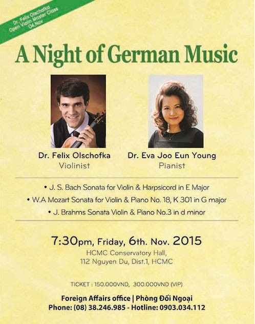 A concert titled “A German night” featuring by violinist Dr. Felix Olschofka and pianist Dr. Eun Young Joo will take place at Ho Chi Minh City Conservatory of Music on November 11.