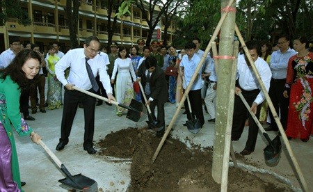Member of the Politburo and chairman of Viet Nam Fatherland Front Central Committee, Nguyen Thien Nhan (second left), plants a commemorative tree at the Co Loa High School in Ha Noi's Dong Anh District on the occassion of the Viet Nam Teachers' Day November 20. — VNA/VNS Photo Nguyen Dan