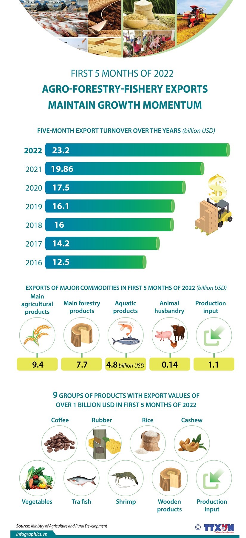 Agro-forestry-fishery exports hit about US$23.2 billion in the first five months of 2022, posting a year-on-year increase of 16.8 percent. Nine groups of products saw export values of more than US$1 billion in the period, including coffee, rubber, rice, cashew and vegetables.