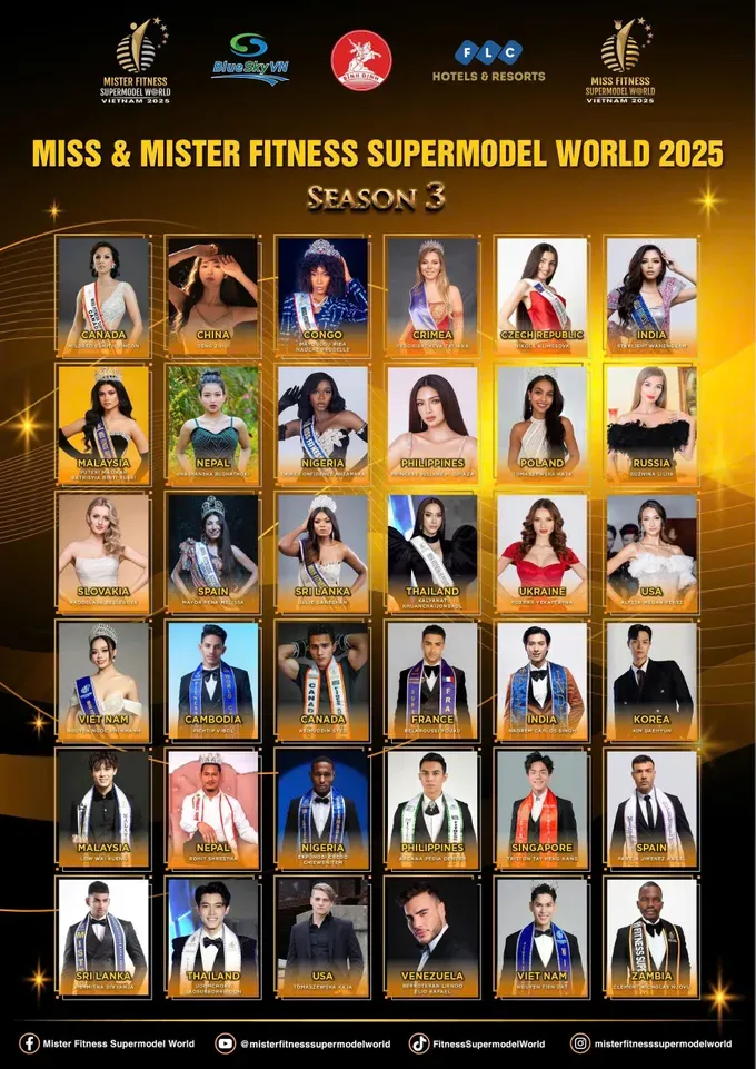 The judging panel for Miss & Mister Fitness SuperModel World 2025 will comprise experts, artists, and cultural figures from both Vietnam and abroad, including Mr. Huynh Ngoc Minh, Vice President of the Vietnam Weightlifting and Bodybuilding Federation; Ms. Tran Thi Kim Qui, Standing Vice President of FLC Hotels & Resorts; businesswoman Duong Thu Huong; Miss Earth 2021 Destiny Wagner; World Miss Tourism Ambassador 2018 Phan Thi Mo; Mister Supranational Asia 2022 Dat Kyo; Nguyen Huu Anh, who claimed the fourth runner-up title at the Man of the World Male Pageant in 2022; and Miss and Mister Fitness SuperModel World 2024, Kirsten Dawn and Artyom Feygelman.