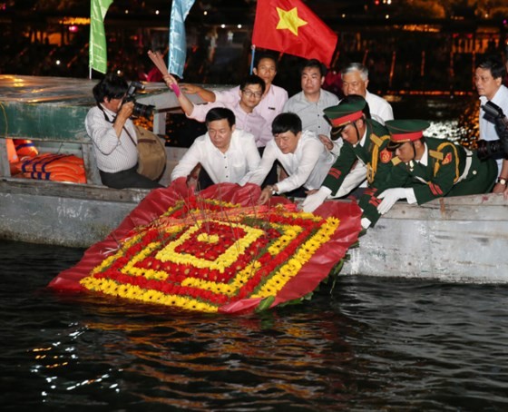 The delegation drops flower garlands and colored lanterns on Thach Han River and prays peace of heroes, martyrs soul in the citadel to commemorate the martyrs.