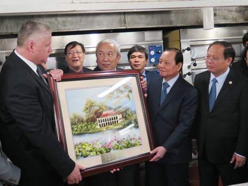 Mr. Le Thanh Hai offeres a painting of Dragon House Wharf, where Ho Chi Minh Museum is based and young guy Van Ba departed his journey for finding ways to liberate the nation in 1911, to a manager of the Omni Parker House.