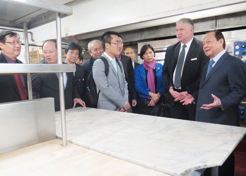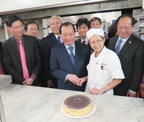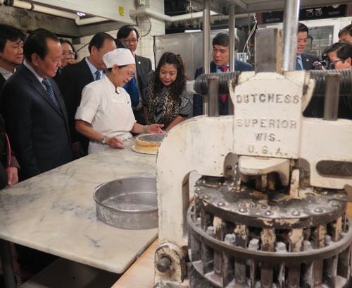 A manager introduces cake making equipments which Van Ba ever used during the visit of HCMC delegation to Omni Parker House on July 16.