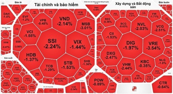 The securities sector experienced substantial declines. Specifically, SSI decreased by 2.24 percent, VND fell by 2.14 percent, HCM was down by 1.64 percent, VCI saw a 1.55 percent drop, AGR declined by 1.09 percent, BVS witnessed a 1.67 percent decrease, and VIX dropped by 1.44 percent.