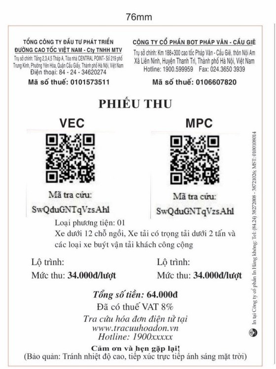 Specifically, toll stations on expressways managed and exploited by VEC will not apply self-printed invoices or pre-printed invoices to vehicle owners when they pay road use service charges. Thus, drivers will receive a self-printed or pre-printed toll ticket for exiting the expressway.
