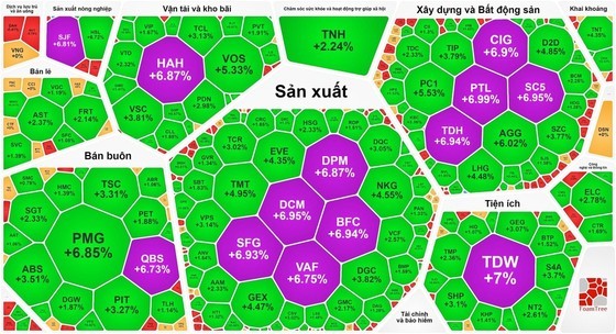 In the real estate stock category, excluding the three Vingroup companies, which all experienced declines, several stocks displayed strong performance, including BCM going up by 2.25 percent, NVL rising by 1.85 percent, KBC surging by 3.36 percent, VCG climbing by 2.62 percent, PC1 advancing by 5.53 percent, ITA increasing by 2.44 percent, SZC growing by 3.77 percent, and AGG jumping by 6.02 percent.