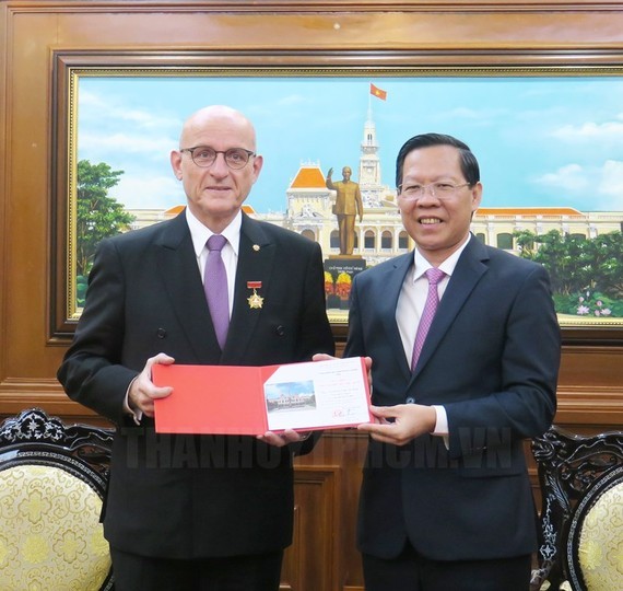 In order to honor positive contributions to the relationship between Switzerland and Ho Chi Minh City, Chairman Phan Van Mai granted the Ho Chi Minh City Badge to the Swiss Consul General.