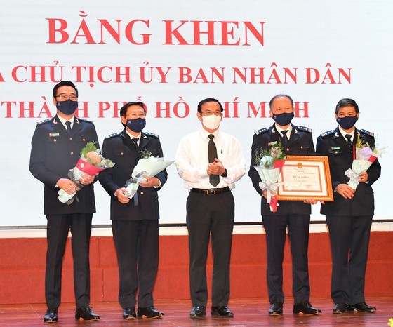 Secretary of the Municipal Party Committee Nguyen Van Nen grants Certificates of Merit to some individuals and collectives of the HCMC Customs Department. (Phooto: Viet Dung)