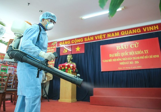 Disinfection at a election point of Binh Thanh District, HCMC