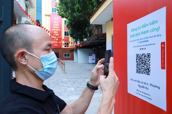 A voter performs online medical declaration at Election No.4, Nguyen Du Ward, Hai Ba Trung District, Hanoi City.