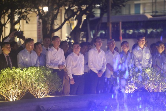 Chairman of the Municipal People’s Committee Nguyen Thanh Phong and leaders of the city pressed the button to inaugurate the art fountain (Photo: Quoc Hung)