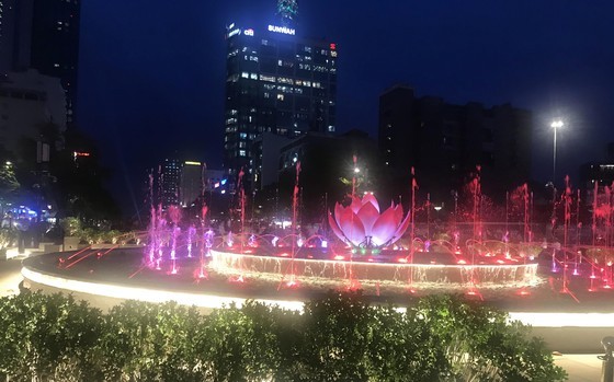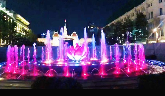Chairman of the Ho Chi Minh City People’s Committee Nguyen Thanh Phong and other leaders of the city pressed the button to inaugurate the circle- shaped art fountain at the intersection of Nguyen Hue and Le Loi last night after four months of construction.