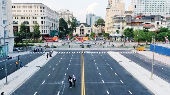 On the occasion of the national holidays, the construction barriers serving underground metro station project in front of the Ho Chi Minh City Opera House on Le Loi Street, District 1 under the Ben Thanh - Suoi Tien metro line project (a session from Nguyen Hue Street to Pasteur Street) were removed, creating a clear, spacious and beautiful space there.