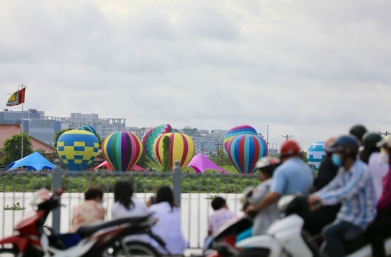 A hot-air balloon with a height of 18 meters and a diameter of 14 meters carrying a national flag flying high in the sky over HCMC (Photo: SGGP) |