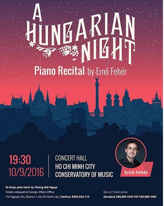 The “Hungarian Night” concert featuring famous Hungarian pianist Erno Feher will be held at the Ho Chi Minh City Conservatory of Music on September 10.