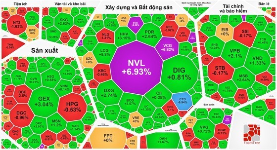 Notably, over VND1.5 trillion was pumped into NVL (Novaland) shares, leading the stock to hit the daily trading ceiling with an outstanding demand of more than 4.5 million shares by the session's close.