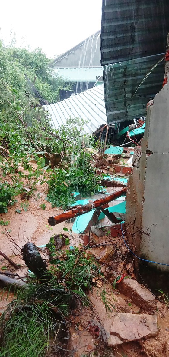 Heavy rain caused rocks and soil on the mountain to suddenly fall down, collapsing the wall of Dao Thi T.'s house in Can Luong Village in An Dan Commune in Tuy An District. (Photo: SGGP)