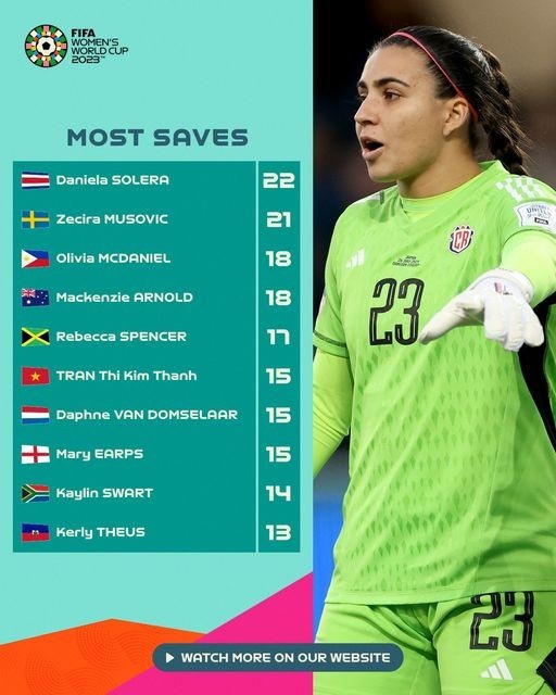 According to the data, the top spot is claimed by goalkeeper Daniela Solera (Costa Rica), with 22 successful saves for her team. In the second position is Zecira Musovic (Sweden) with 21 saves, closely followed by Olivia McDaniel (Philippines) and Mackenzie Arnold (Australia), both with 18 saves, securing the third place. Rebecca Spencer (Jamaica) takes the fourth spot with 17 saves. The remaining slots in the top ten are held by Daphne van Domselaar (Netherlands) with 15 saves, Mary Earps (England) with 15 saves, Kaylin Swart (South Africa) with 14 saves, and Kerly Theus (Haiti) with 13 saves.