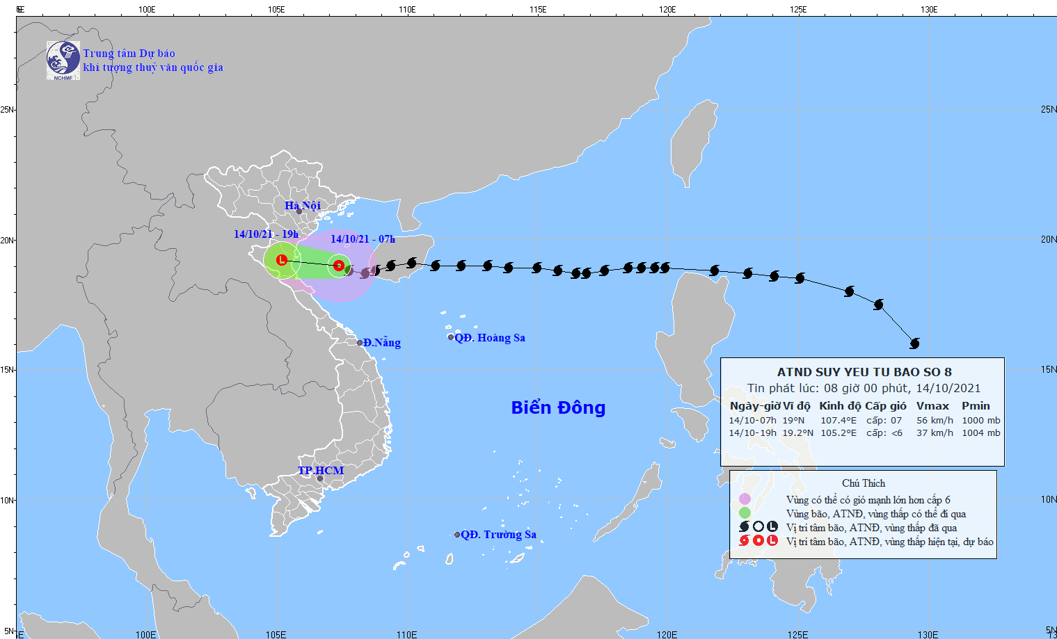 The system is forecast to continue to downgrade to a low-pressure zone and bear down the mainland provinces of Nghe An and Thanh Hoa.