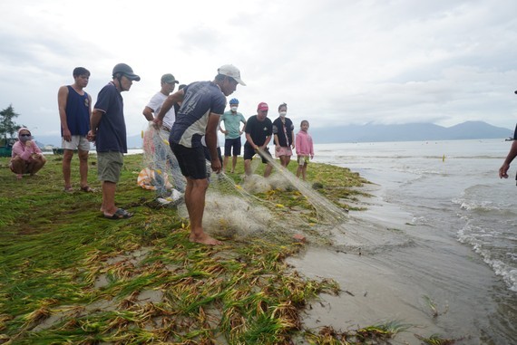 In Nguyen Tat Thanh Street near Phu Loc Bridge, Thanh Khe District, people use nets to catch freshwater fish from manholes after the storm.