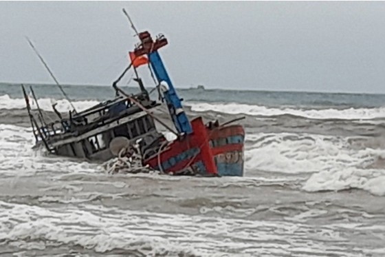 According to initial information, as of 2:30 a.m., four fishermen of boat TTH 91075 TS were drifted onto the shore and the boat was sunk at around 20 meters from the shore of Phu Hai Commune, Phu Vang District amid strong waves and high winds.