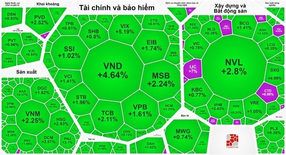 Furthermore, contributing to the significant surge of the VN-Index is the financial and banking stock group. Among this group, a majority of banking stocks witnessed gains, with some performing exceptionally well, such as TCB rising by 2.11 percent, MSB increasing by 2.24 percent, VPB growing by 1.61 percent, and EIB advancing by 1.74 percent.