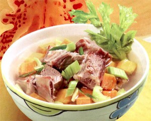 Fry the flank meat with a little oil, then pour water into the pot and stew it for a while. When the flank meat is soft and done, put sweet potatoes in and cook within 15 minutes, then add celery and green onion and we finish making the soup.