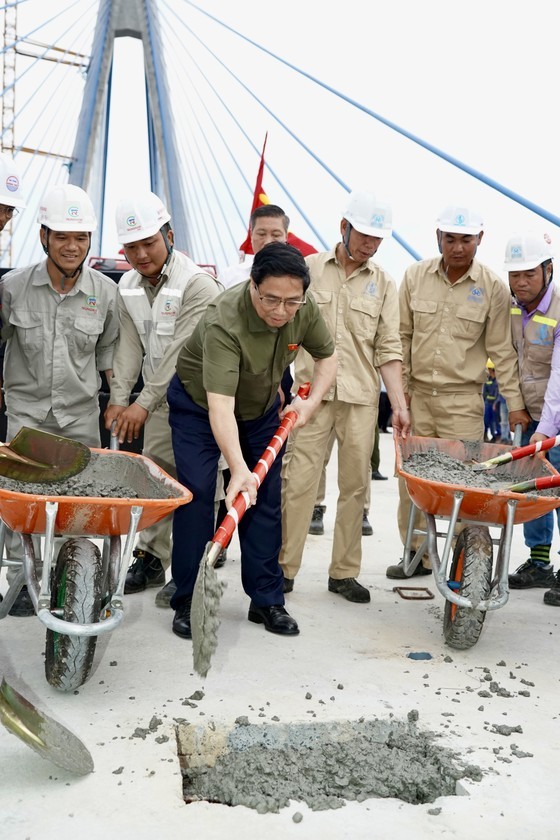 | PM Pham Minh Chinh highly appreciates the efforts of all construction engineers and workers who completed the project timely. (Photo: SGGP) |