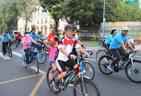 The parade delegation rode bikes across the streets Le Duan - Hai Ba Trung - Ton Duc Thang - Nguyen Hue and came to President Ho Chi Minh’s Monument on Nguyen Hue Street to offer flowers to the President.