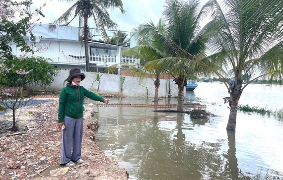 Not far away from the dike, the section of Saigon River embankment passing Neighborhood No.8 in Nhi Binh Commune is enduring erosion, but residents here are now allowed to self-reinforce it, resulting in land loss by the river day by day. In particular, 100m2 of the land lot of Pham Thanh Huong, a local person here, has been loss.