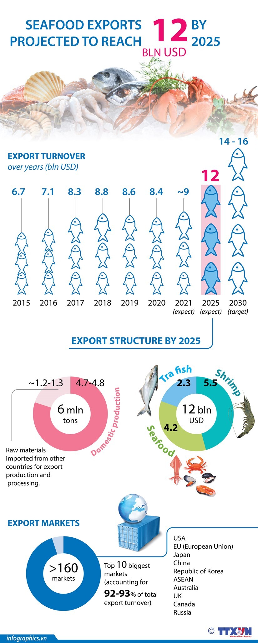 The Vietnam Association of Seafood Producers and Exporters forecasts that seafood exports would increase by an average of 7 percent yearly between 2021 and 2025, reaching US$12 billion in 2025.