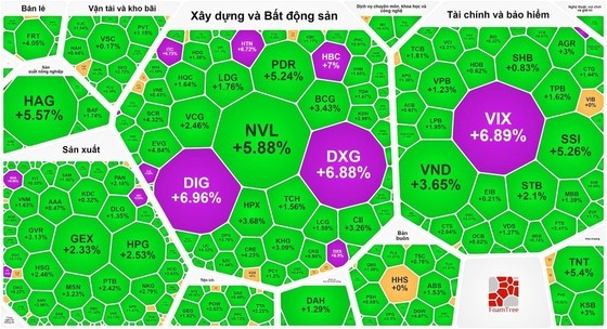 Due to robust buying demand, the market swiftly adopted a predominantly green and purple trend. On the HOSE, the number of advancing stocks was triple that of declining stocks. Specifically, 400 stocks saw gains, while over 100 stocks faced declines.