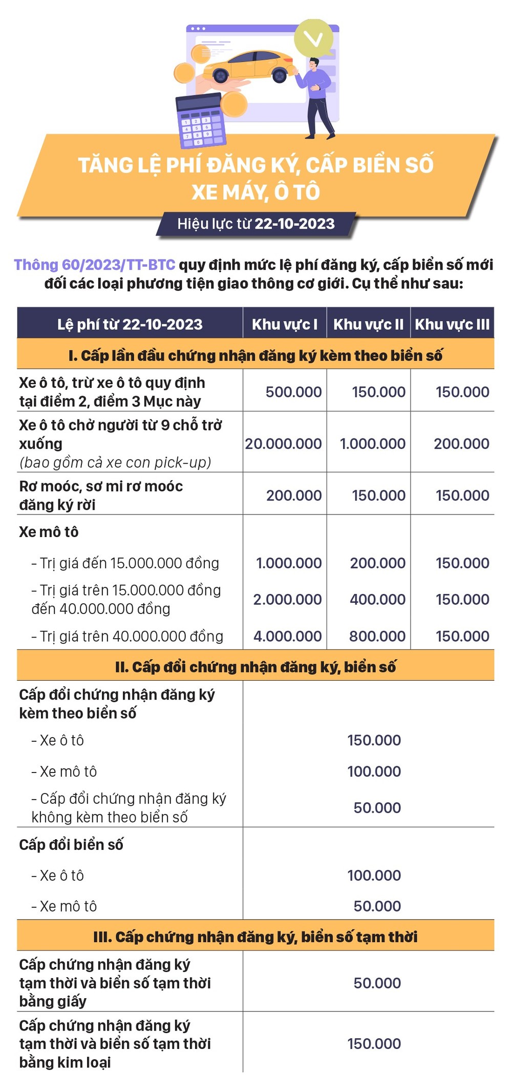 The Circular 60|2023 of the Ministry of Finance regulates registration fees and issuance of new license plates for all types of motor vehicles in different areas.
