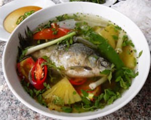 Embalm the fish with peppercorn, onion, monosodium glutamate and a little salt. Then, put them into boiling water, waiting until the fishes are cooked, then add flagrant knotwed, green chili and a little fish sauce. We can also add some tomatoes so that the soup looks more colorful and delicious but still keep the sweet taste of the fish.