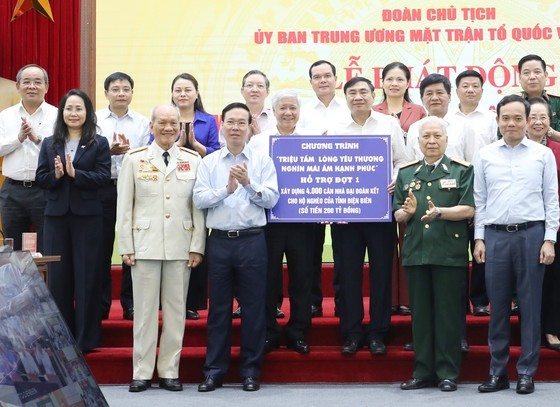 At the ceremony, State President Vo Van Thuong along with Chairman of the Vietnam Fatherland Front Central Committee Do Van Chien and Deputy Prime Minister Tran Luu Quang awarded funding support for the first phase with a total value of VND200 billion (US$8.5 million), equaling 200 "great unity" houses for Dien Bien Province.