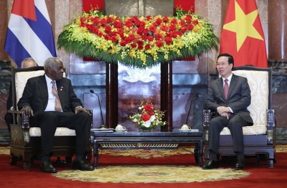 | State President Vo Van Thuong (R) receives Chairman of the National Assembly of People's Power of Cuba Esteban Lazo Hernandez at the Presidential Palace in Hanoi on September 25. (Photo: SGGP) |