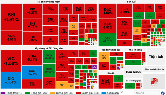 Real estate stocks continued to plummet, with DXG, DIG, and NBB hitting floor limits, while NVL plunged by 5.48 percent, DXS fell by 4.48 percent, PDR retreated by 3.42 percent, NLG collapsed by 3.31 percent, CII slumped by 3.49 percent.