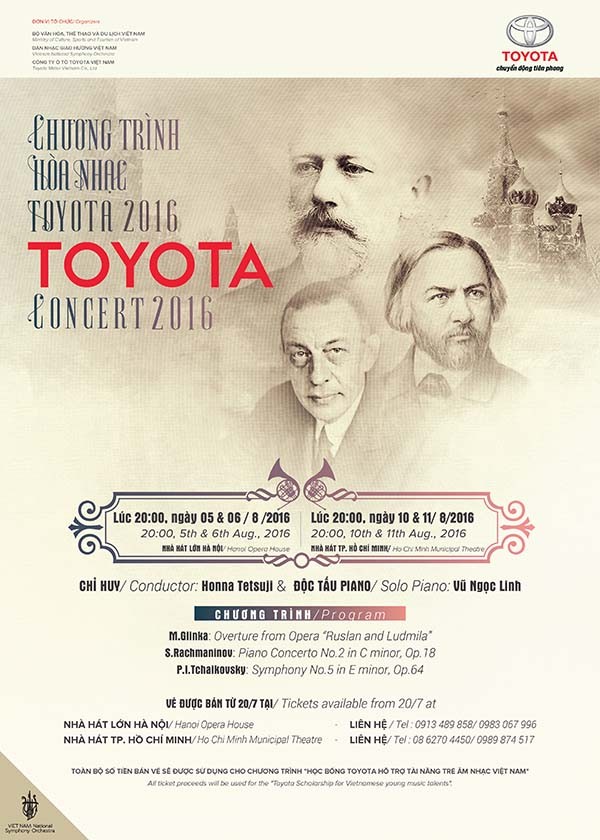 The concert is organized by Toyota Vietnam Foundation with the support of Vietnam National Symphony Orchestra (VNSO). All proceeds from ticket sales will be donated to the Toyota Vietnam Foundation to fund scholarships for talented young musicians in schools across the country.