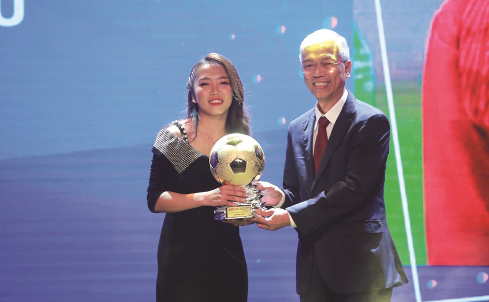 Deputy Chairman of Ho Chi Minh City People's Committee Vo Van Hoan awards golden ball in the category of female to striker Huynh Nhu.