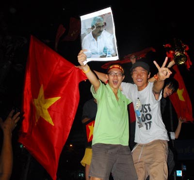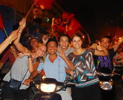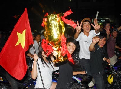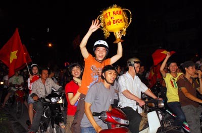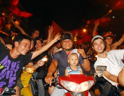 Cheering football fans filled the streets of Ho Chi Minh City and Hanoi to celebrate their win by the national squad who achieved a place in the semi-finals of the AFF Suzuki Cup 2010, on December 8.