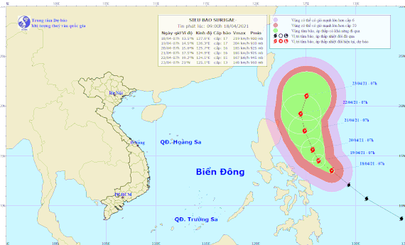 As reported, the center of the eye of typhoon Surigae was at 13.5oN, 127.6oE, 420km East of the Central Philippines. It is moving slowly Northwestward, but is forecast to continuously change its direction.
