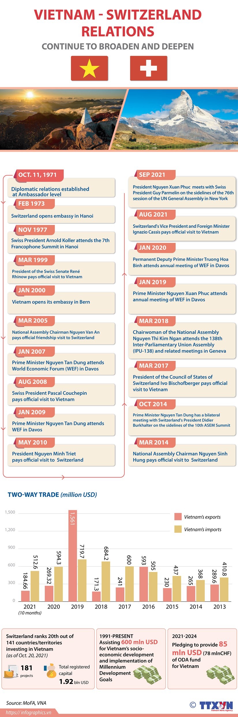 President Nguyen Xuan Phuc will pay an official visit to Switzerland from November 25-29. The visit is made at the invitation of Swiss President Guy Parmelin. More than half a century, relations between Vietnam and Switzerland have developed strongly not only in politics and multilateral cooperation but also in trade, investment, science, culture, tourism and people-to-people exchange.