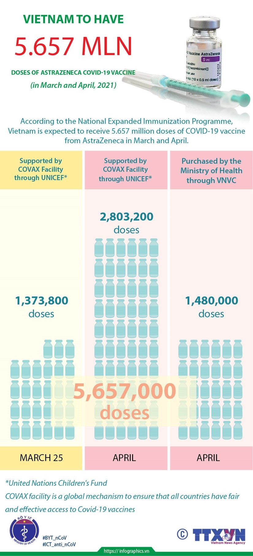 Vietnam is expected to get 5.657 million doses of AstraZeneca vaccine against Covid-19 in March and April, according to the National Expanded Immunization Program.