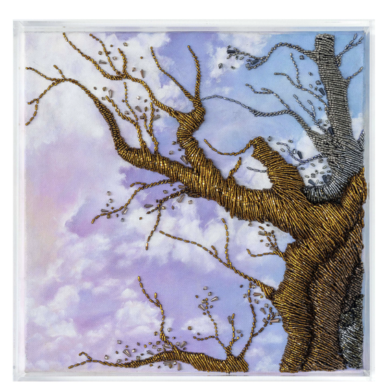 The indoor space displays 10 artworks in different genres of arts and materials, such as reliefs, double-sided embroidery with metal wire, oil paintings, applique embroidery craft telling another story, a different perspective and techniques of the “Flower of Life”’ works.