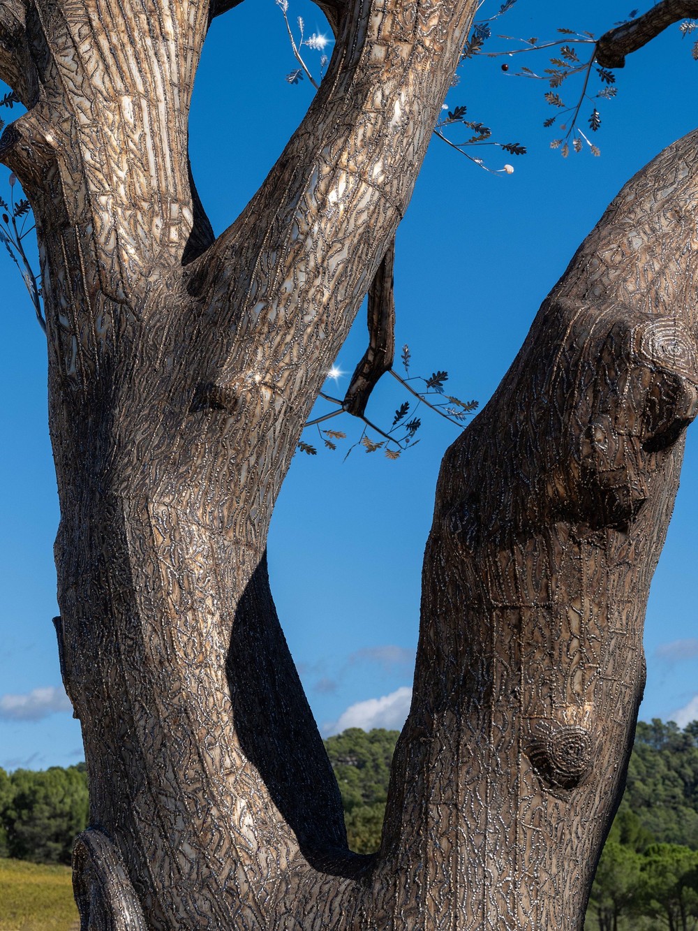 The highlight exhibit is an 18-meter-tall dead dry oak tree at the Château La Coste’s campus. She shaped the artwork based on the original structure of the dead tree and welded several stainless steel leaves on it. Thousands of stainless-steel leaves hanging and "flowers" that are made from colorful, reflective quartz stones on the branches create a sparkle effect as if playing with the sunlight.