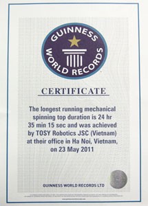 A spinning top invented by a Vietnamese robotic firm has become the country’s first toy to win World Guinness certificate for the longest mechanical running duration.