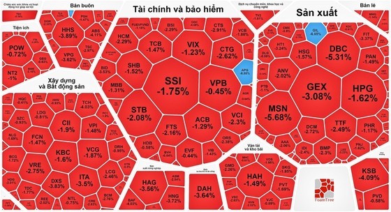 Stocks across all sectors fell into a bearish market today, led by the loss of Vietcombank (VCB). VCB shares tumbled by nearly 1.9 percent, followed by BIDV (BID), Masan Group (MSN), and VietinBank (CTG), down from 2.62 percent to 5.68 percent.