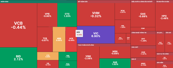 The other sectors, including securities, real estate, and banking, saw a significant decline in the majority of their stocks. Except for VIC, only a few large-cap stocks like CTG, BID, HDB, and SAB managed to stay in positive territory, while the rest experienced losses.