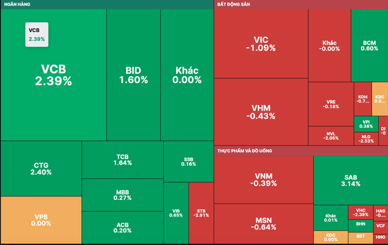 Specifically, HSG hit the ceiling. Although HPG and NKG failed to keep the maximum allowed daily increase, they also jumped by 5.57 percent and 6.56 percent, respectively. TLH enlarged by 5.3 percent. The banking stock group also rallied robustly, contributing largely to the VN-Index's gain, with VCB up 2.39 percent, BID up 1.6 percent, CTG up 2.4 percent, TCB up 1.64 percent, and HDB up 1.67 percent.