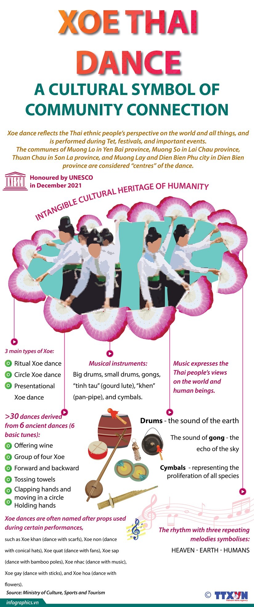 Xoe dance reflects the Thai ethnic people’s perspective on the world and all things, and is performed during Tet, festivals, and important events. The communes of Muong Lo in Yen Bai province, Muong So in Lai Chau province, Thuan Chau in Son La province, and Muong Lay and Dien Bien Phu city in Dien Bien province are considered centers of the dance.